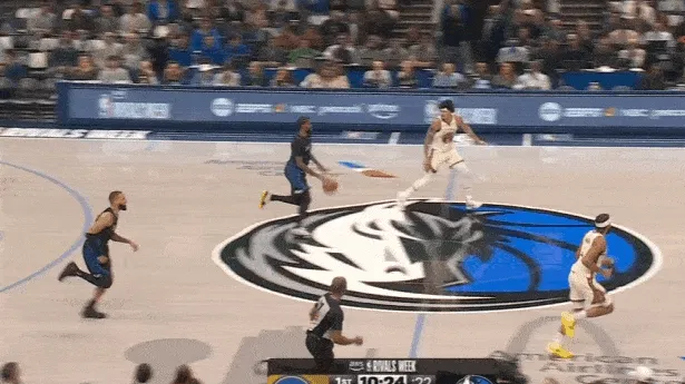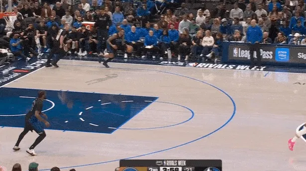 紧接着继续乘胜追击,过半场后立即起速并发动“Drag Screen”点名库里,行进至三分线使用小跳步后立即二次加速直杀篮下,过掉库里后顶着霍福德回收护框上篮打进。