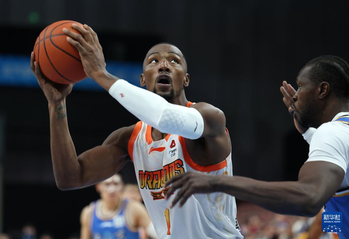 1月13日,江苏肯帝亚队球员贾尔斯(左)在比赛中进攻。