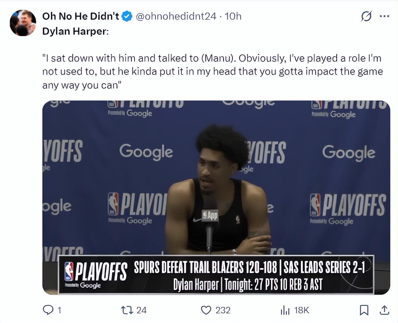 赛后马刺主帅米奇谈到哈珀:就像你们看到他的数据那样他很出色,在季后赛的对抗中他的身体天赋肉眼可见,强度越大越能看出一个球员的基本功,有天赋、有能力的球员就能接管比赛。