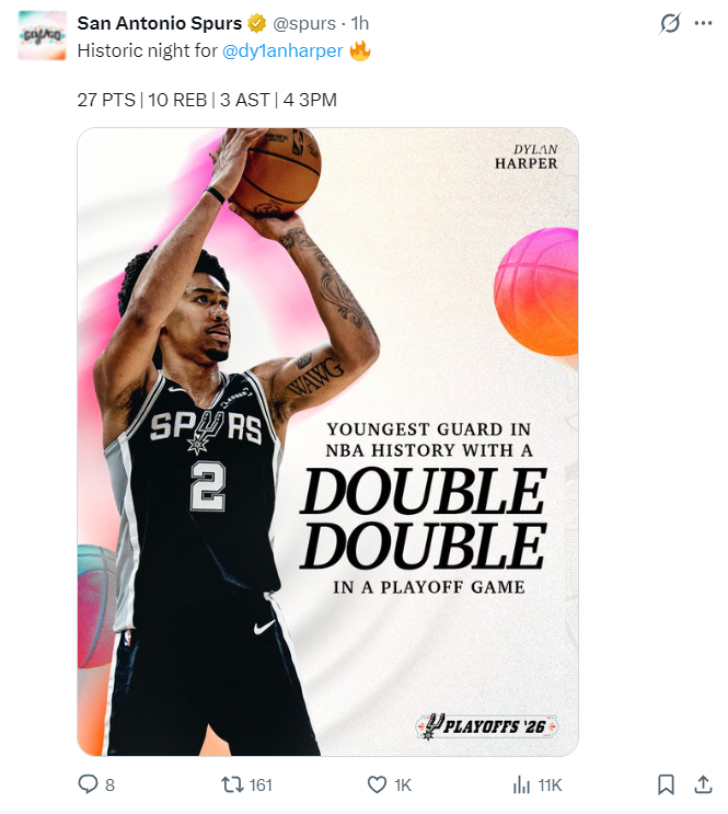 7.队史1998年邓肯新秀后季后赛单场新秀最高分27分;