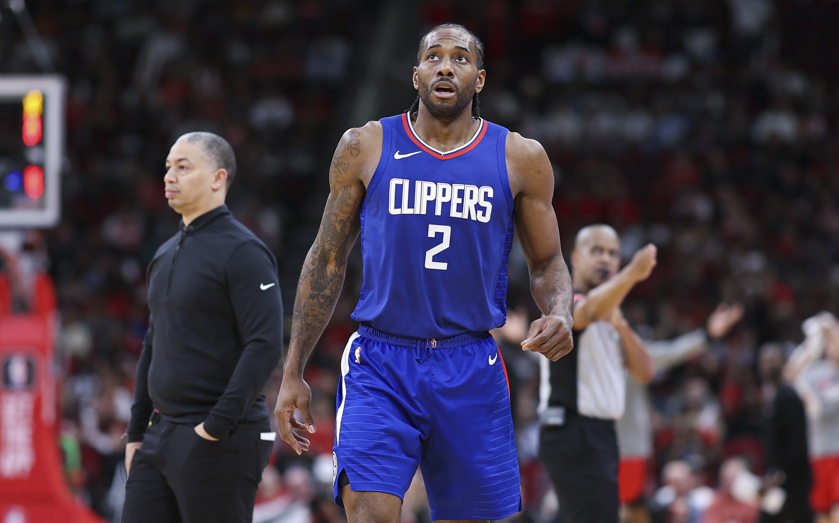 赛后,快船主帅泰伦·卢在接受采访时谈到了伦纳德带着手腕伤势出战的表现:“他是在以身作则。他每晚都坚持上场,克服着伤病以及当前所面临的种种困境,带领球队赢取胜利。”